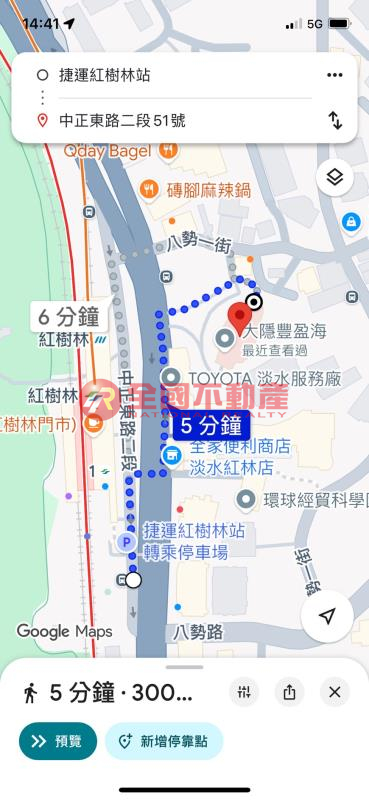 捷運紅樹林站約350公尺,依Google步行約5分鐘